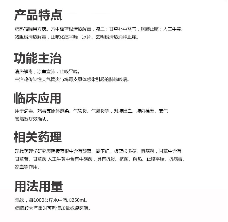 主治雞傳染性支氣管炎與雞毒 支原體感染引起的肺熱咳喘。