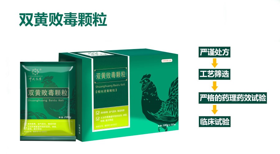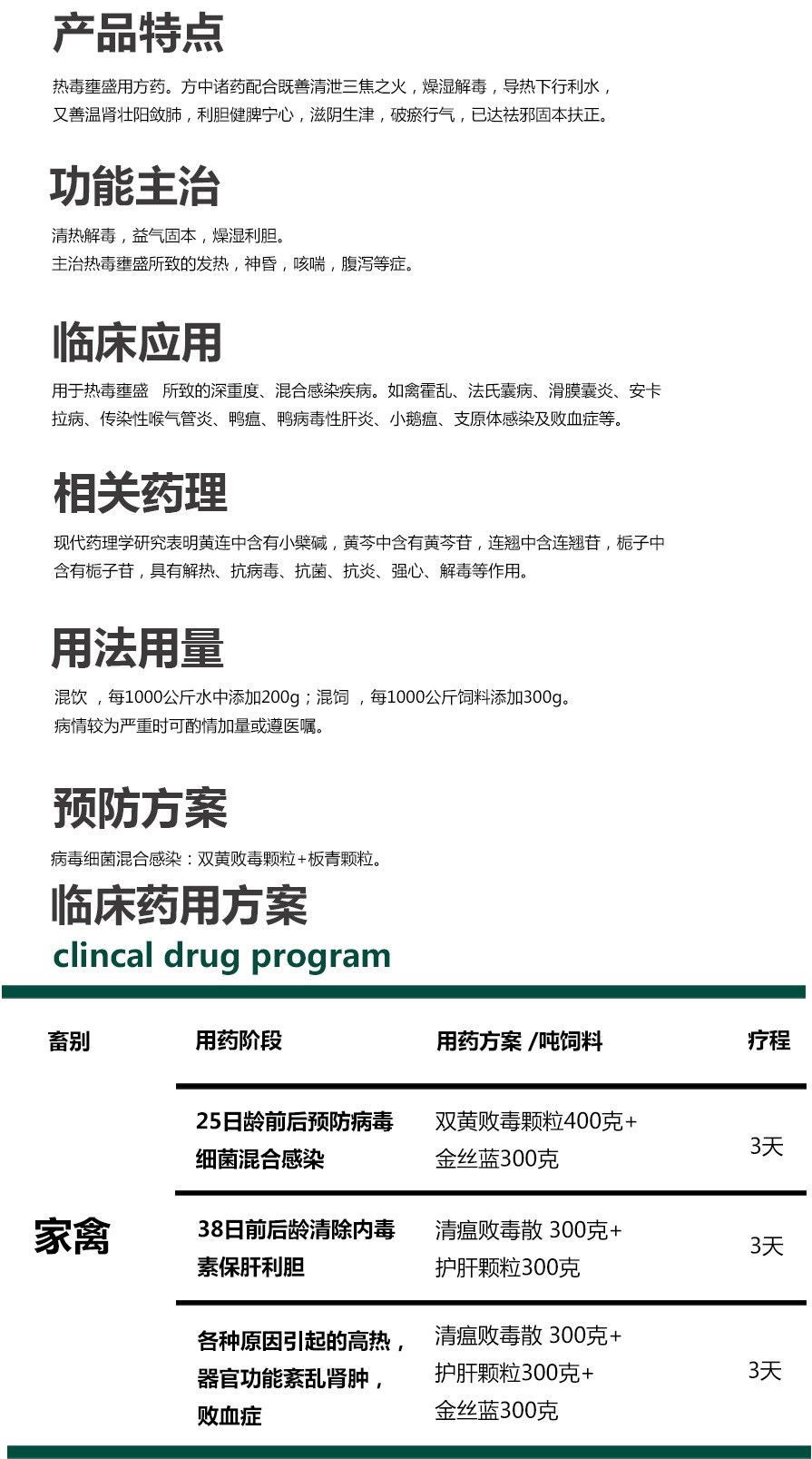 【處方】 黃連、黃芩、黃芪、茯苓、茵陳、蛇床子、黃精、連翹、梔子、五倍子、莪術(shù)、三棱。 【性狀】 本品為棕色至棕褐色的顆粒;氣香,味甘、苦。 【功能】 清瘟敗毒、涼血消斑、益氣固本。 【主治】 熱毒壅盛所致的發(fā)熱,神昏,咳喘,腹瀉等癥。 【用法與用量】 混飲,每1000公斤水中添加200g; 混飼,每1000公斤飼料添加300g。 病情較為嚴重時可酌情加量或遵醫(yī)囑。