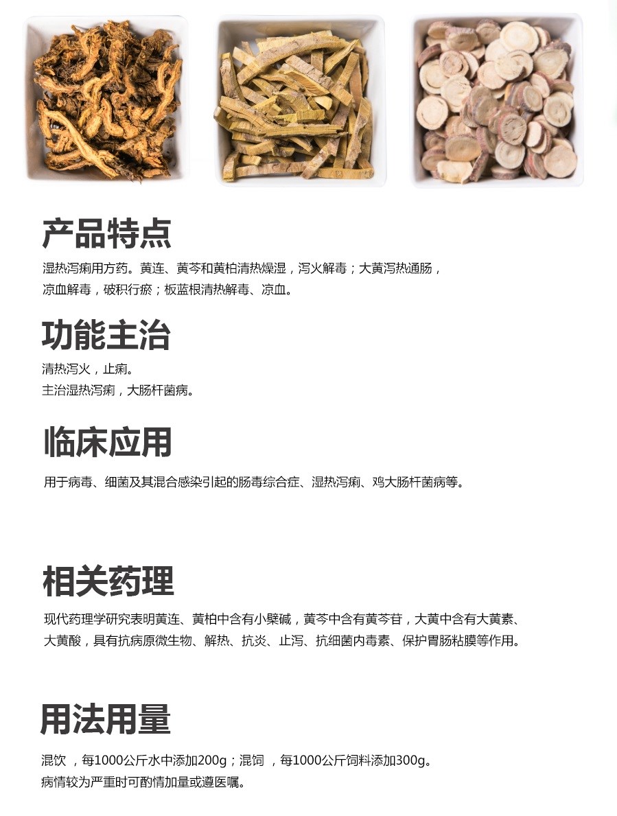 【主治】 濕熱瀉痢,雞大腸桿菌病。
