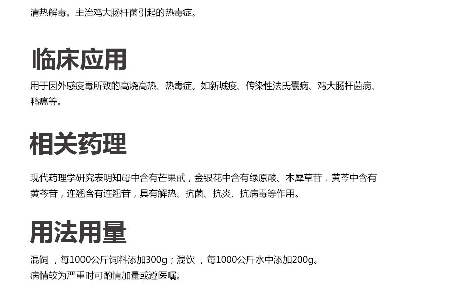 清熱解毒,主治雞大腸桿菌引起的熱毒癥。