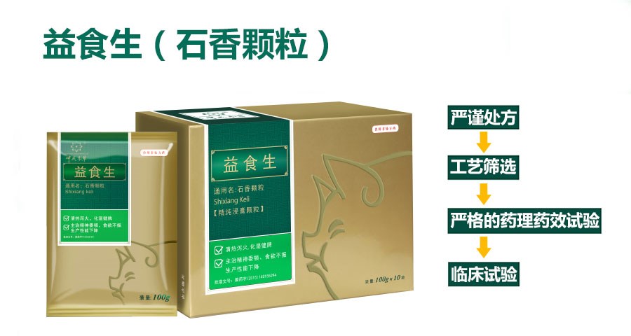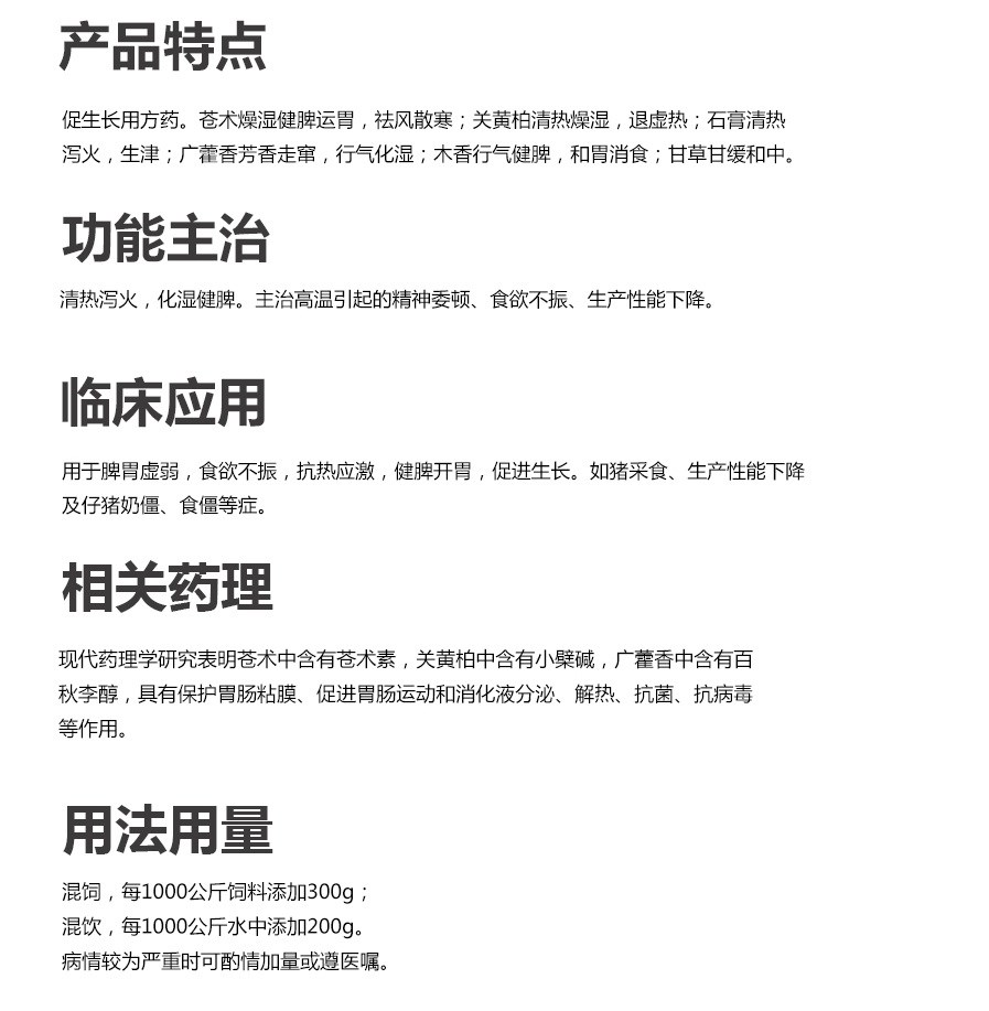 清熱瀉火,化濕健脾。主治高溫引起的精神委頓、食欲不振、生產性能下降。