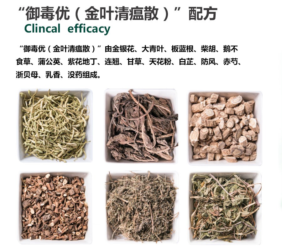 【處方】金銀花、大青葉、板藍根、柴胡、鵝不食草、 蒲公英、 紫花地丁、連翹、甘草、天花粉、白芷、防風(fēng)、赤芍、浙貝母、乳香、沒藥。