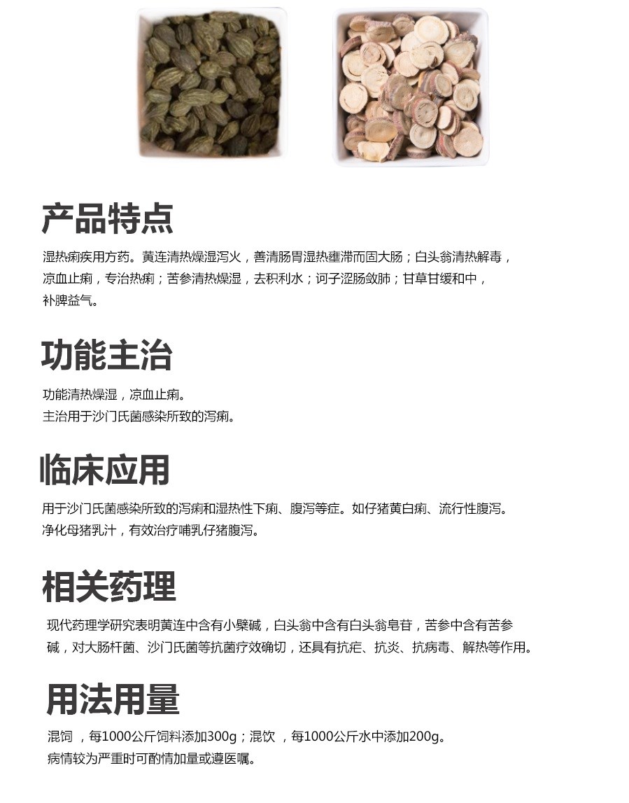 清熱燥濕,涼血止痢。主治用于沙門氏菌感染所致的瀉痢。