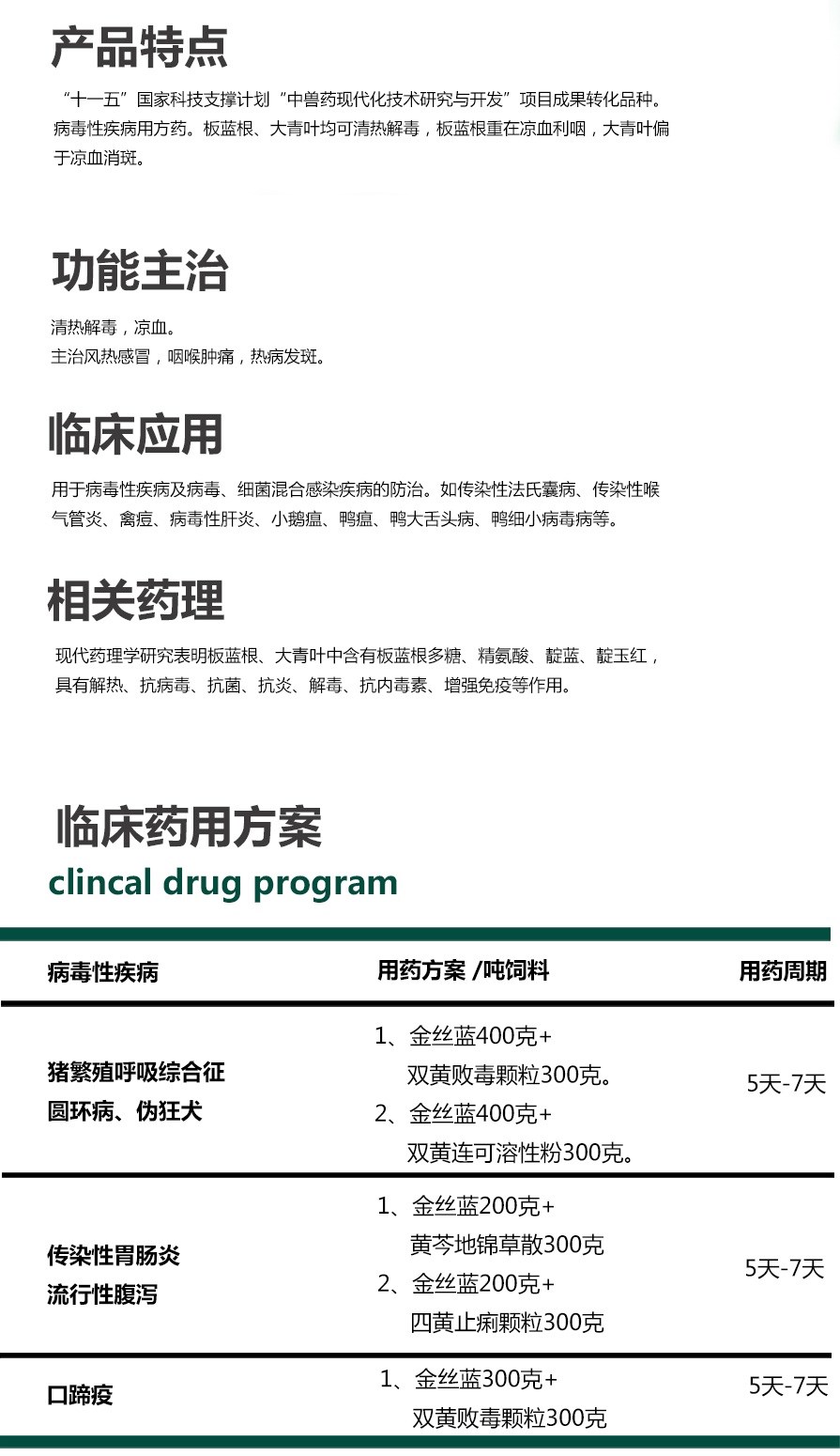“十一五”國家科技支撐計劃“中獸藥現(xiàn)代化技 術(shù)研究與開發(fā)”項(xiàng)目成果轉(zhuǎn)化品種。 病毒性疾病用方藥。