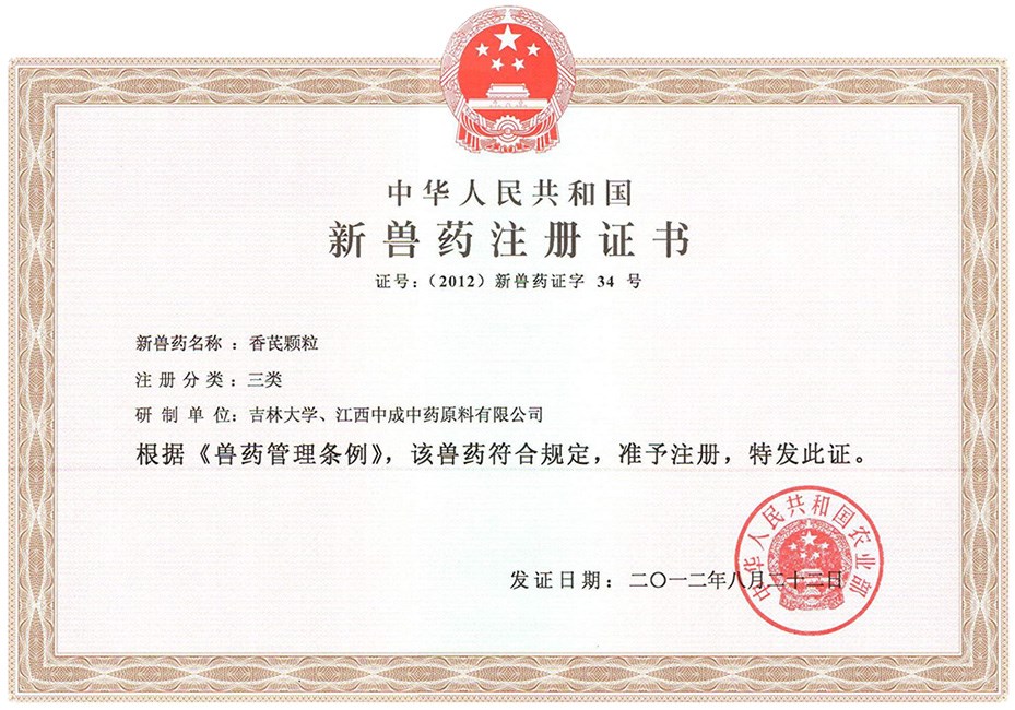 2012年08月22日,由我公司自主研發(fā)的“香芪顆!表樌@得國家三類新獸藥證書,這是我公司在新產品開發(fā)上得又一個突破。 此項研究成果填補了獸藥治療雞大腸桿菌、增強免疫力的空白,該產品的推廣應用,將給雞場養(yǎng)殖帶來巨大的經濟效益。