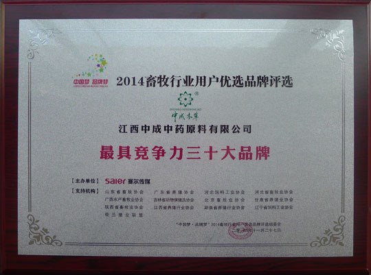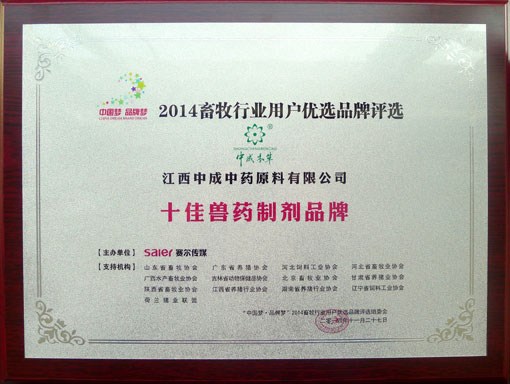 近日,籌備近一年的“中國夢·品牌夢”2014畜牧行業(yè)用戶優(yōu)選品牌評選活動落下帷幕。江西中成中藥原料有限公司以始終堅持“專注綠色藥品、關(guān)愛人類健康“為宗旨,四十余年執(zhí)著于發(fā)展中獸藥技術(shù),為養(yǎng)殖奉獻純正綠色藥品而斬獲《十佳獸藥制劑品牌》、《最具競爭力三十大品牌》兩項大獎。江西中成中藥原料有限公司總經(jīng)理付寧靜以其對中醫(yī)藥的熱愛和一直致力于中獸藥技術(shù)的創(chuàng)新與發(fā)展,為推動中國中獸藥發(fā)展做出貢獻被評選為“中國夢·品牌夢”2014畜牧行業(yè)“用戶優(yōu)選年度十大先鋒人物”。