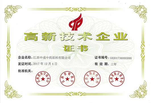 據(jù)最新修訂的《高新技術企業(yè)認定管理辦法》(國科發(fā)火〔2016〕32號)和《高新技術企業(yè)認定管理工作指引》(國科發(fā)火〔2016〕195號)文件規(guī)定,經(jīng)審定,江西中成中藥原料有限公司符合高新技術企業(yè)認定條件,被認定為“高新技術企業(yè)”(證書編號:GR201736000990)。